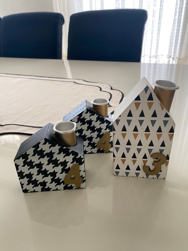 Beyaz, gri ve siyah desenli ev şeklinde mumluk seti, küçük baca ve numaralı detaylara sahip. ️