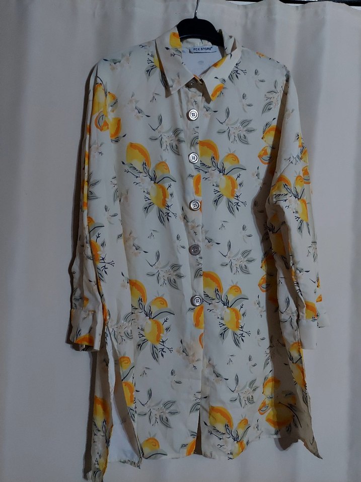 Bohem tarzda, uzun kollu ve düğmeli, sarı ve gri desenli sentetik kumaştan bol kesim kadın gömlek. hiç kullanılmadı sıfır