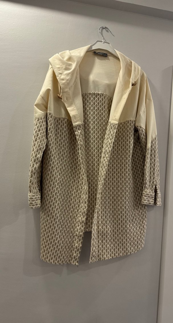 Krem ve kahve renklerde, düğmeli gömlek. Salaş kesim, yakalı ve uzun kollu, sadece bir kaç kez giyilmiştir hiç bir defosu yoktur.