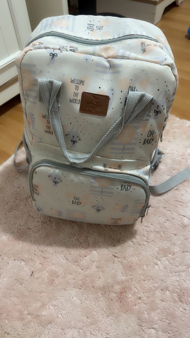 Pastel tonlarda, 'Welcome to the World' ve 'Oh Baby' yazılı desenli gri bebek çantası. Önünde fermuarlı cep ve çift kulplu taşıma imkanı sunar.