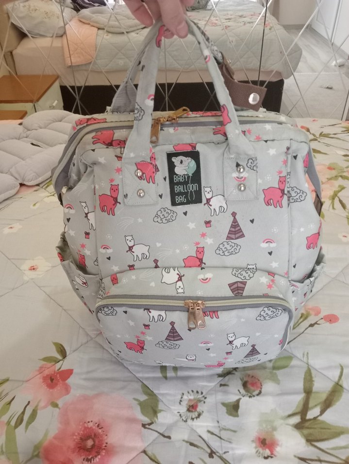 Gri bebek çantası, pembe ve beyaz hayvan desenleriyle süslenmiştir. Çoklu bölmeleri ve sağlam kulpları vardır.