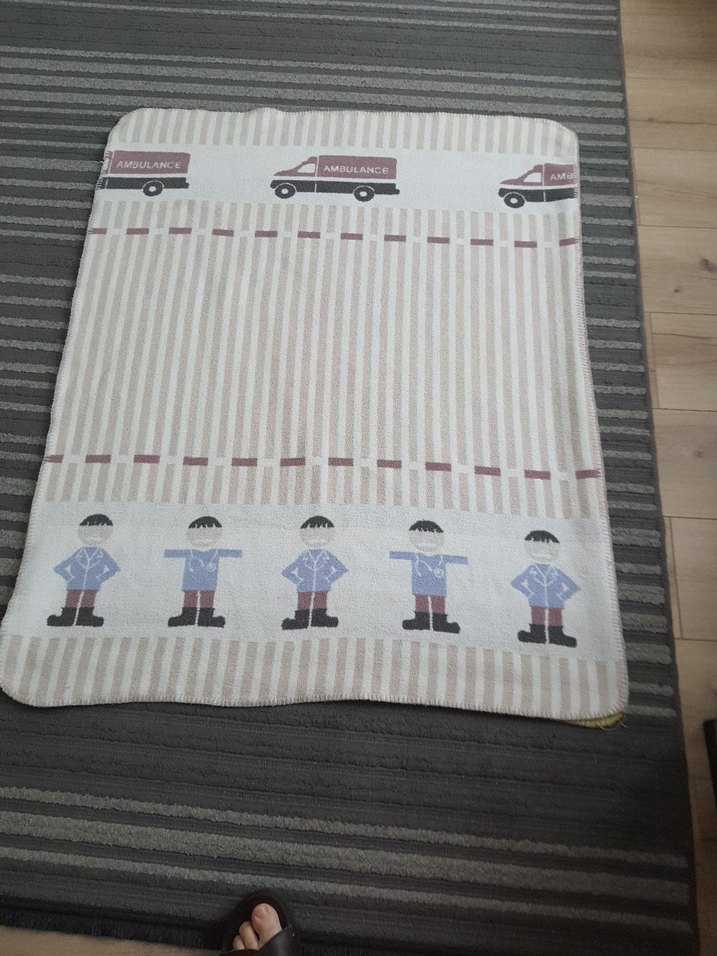 Gri renkte, tekstil malzemeden yapılmış çocuk battaniyesi, üzerinde ambulans ve karakter desenleri bulunur. ️ kenar iplerinde acilmalar var