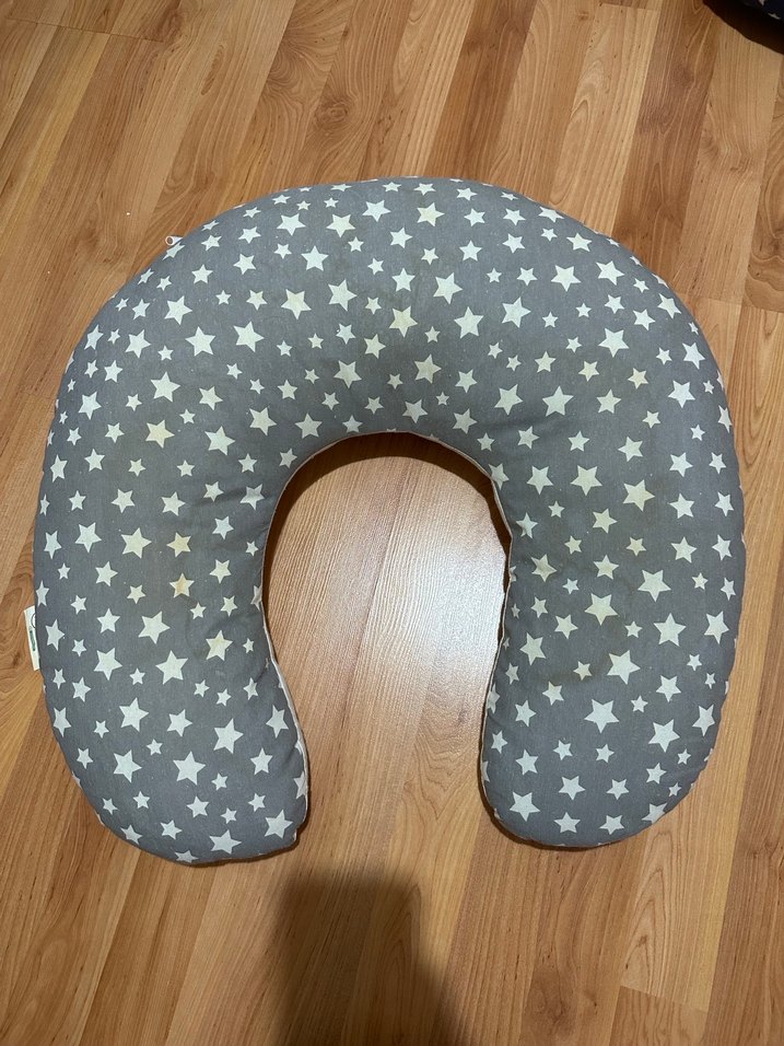 Hamilelik ve emzirme için konfor sağlayan, yıldız desenli gri yastık.
