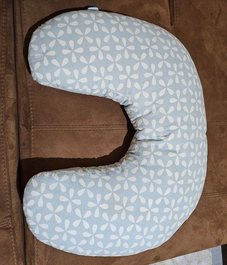 Gri zemin üzerine hafif beyaz çiçek desenli, yumuşak kumaştan hamilelik ve emzirme yastığıdır.
