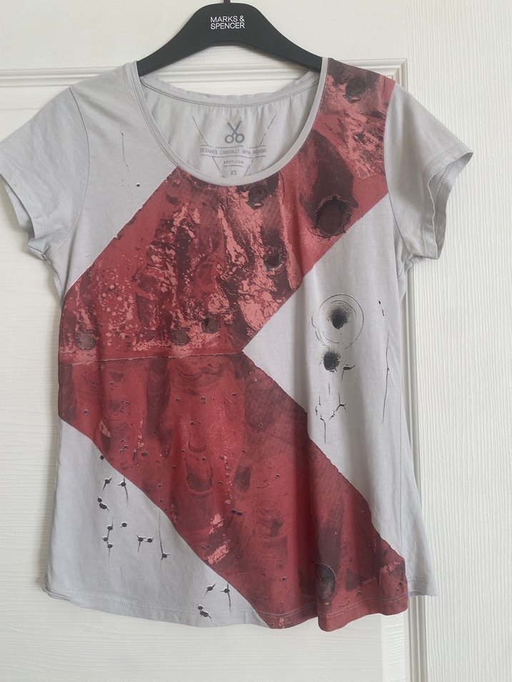 Gri renkte, kısa kollu ve yuvarlak yaka Kırmızı desenli,Dış mekan kullanımına uygundur. Temiz durumdadır