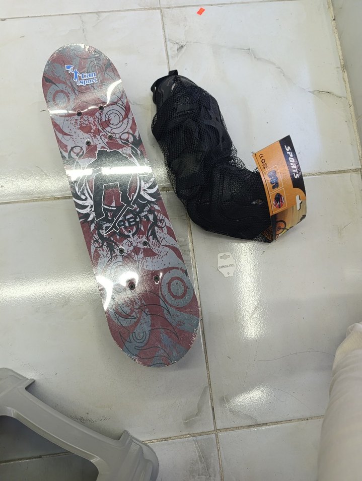 Desenli gri kaykay, koyu renk kauçuk tekerleklerle. Velcro kapamalı siyah file taşıma çantası ile birlikte, spor ve sokak stiline uygun.
