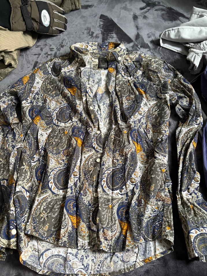 Gri tonlarda, keten kumaştan, düğmeli ve yakalı, bol kesim uzun kollu erkek gömleği. Desenli ve bohem tarzda