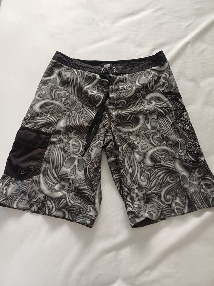 Desenli ve tokalı, bol kesim gri erkek plaj şortu. Mini boy ve sokak stili ile uyumlu.