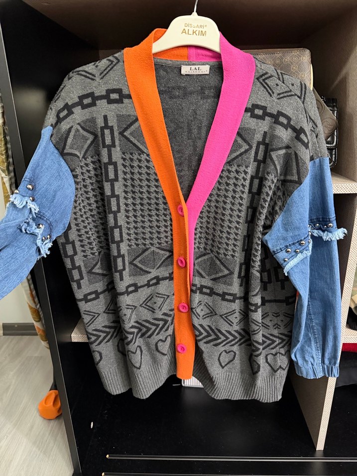 Gri renkli, desenli örgü mini hırka, turuncu ve pembe canlı şeritlerle. Uzun kot kollu, V yaka ve bol kesim, sokak tarzı için uygun.