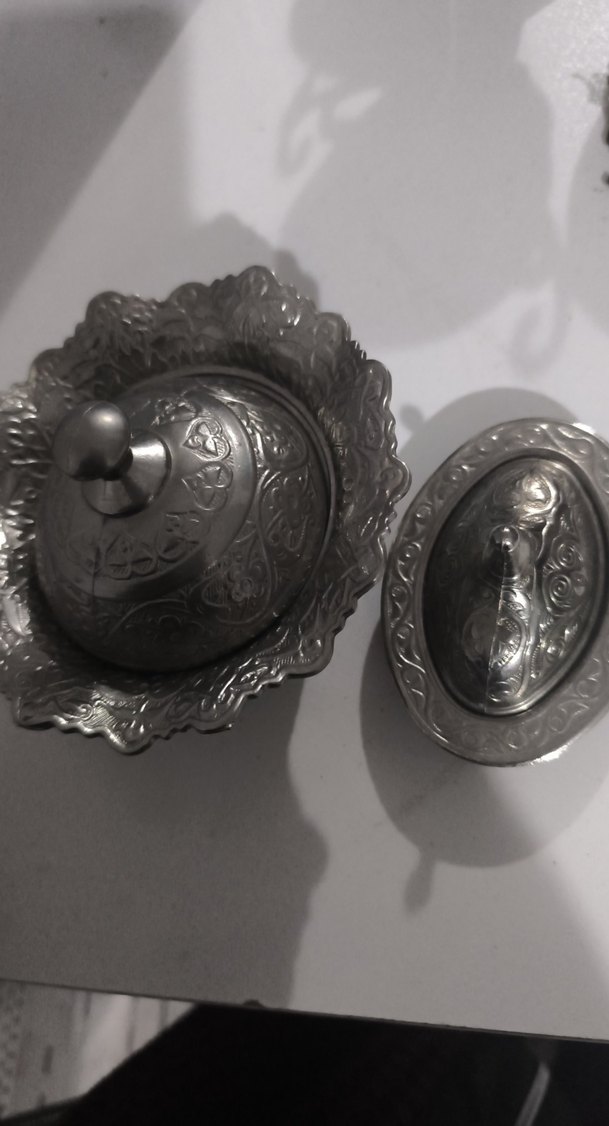 Desenli siyah gri kapaklı tabak, geleneksel tasarıma sahip, kapak ve tabağında detaylı işlemeler bulunur. ️