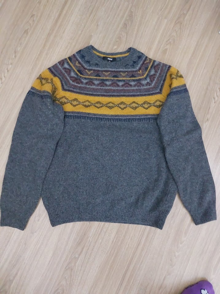 Gri, bohem desenli yaka kısmı ve uzun kollu, yünlü triko erkek kazak. Yumuşak örme kumaştan üretilmiştir, rahat ve sıcak tutar.