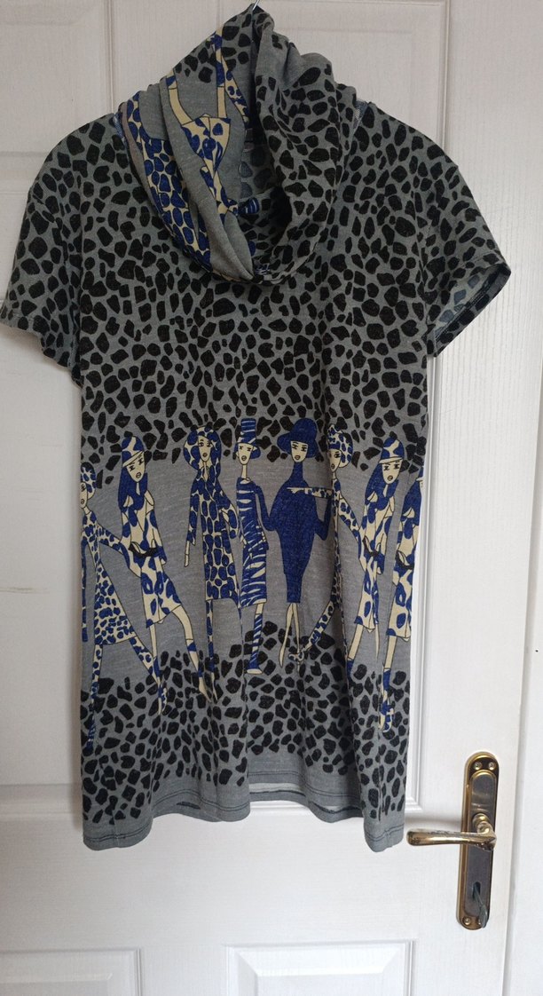 Gri renkli, kısa kollu, yakalı ve drapeli tunik. Sanatsal figür desenleriyle rahat kesim, midi boy ve sokak stili havası sunar. Günlük kullanıma uygun.