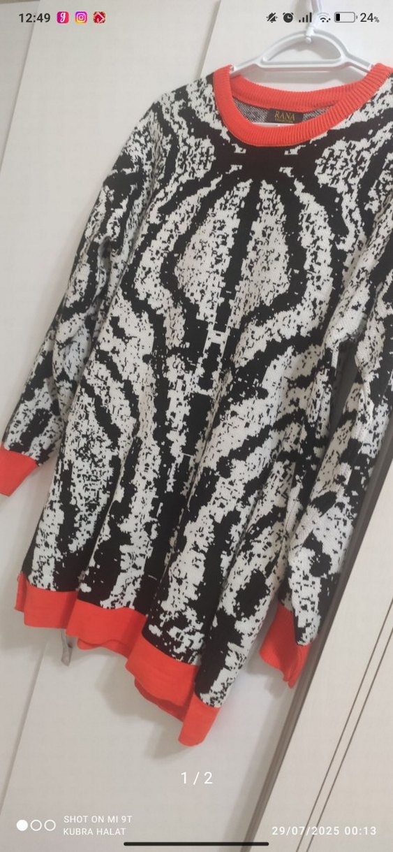 Desenli gri uzun kollu, boğazlı ve bol kesim tunik. Kürk detaylı ve kollar ile etek ucunda canlı kırmızı dokunuşlar içerir.