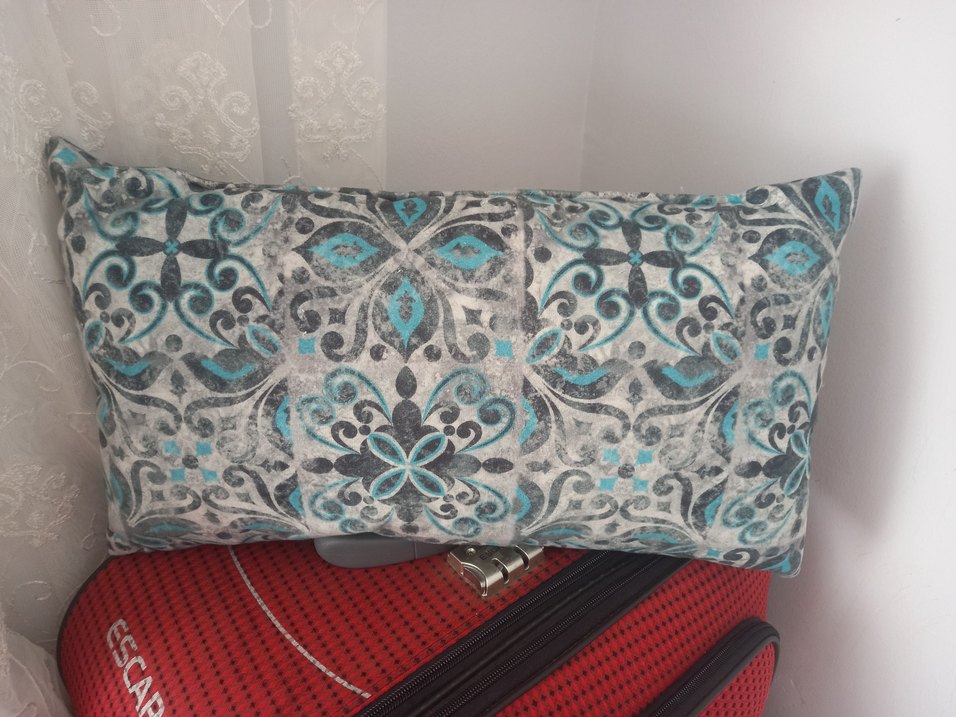 Gri ve mavi tonlarda desenli yastık kılıfı, odanıza dekoratif bir dokunuş katıyor. ️