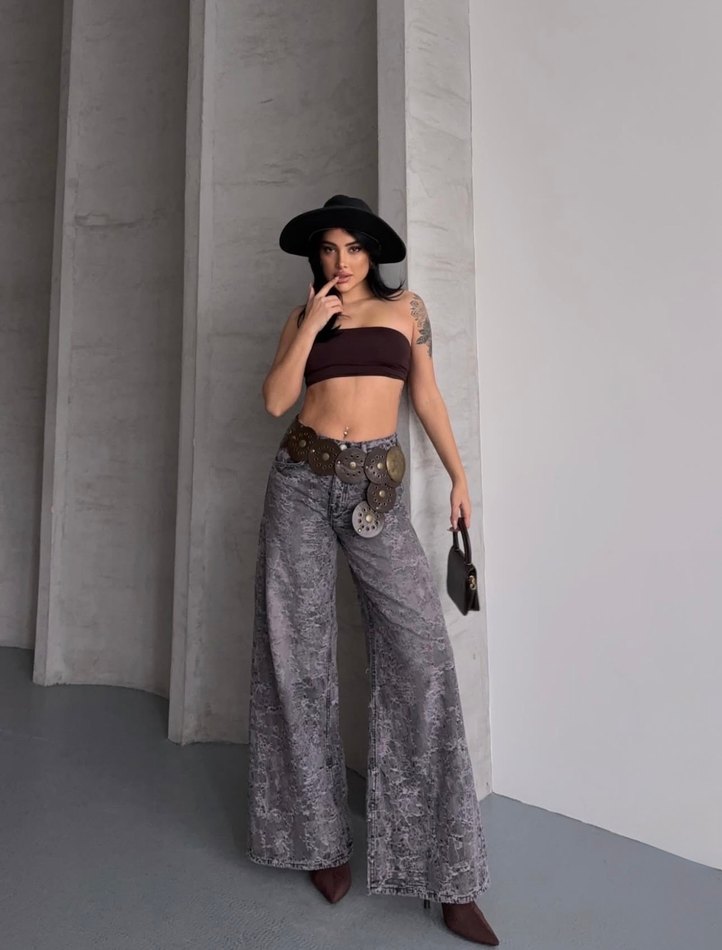 Desenli Gri Wide Leg Pantolon Lovenay.co L Beden