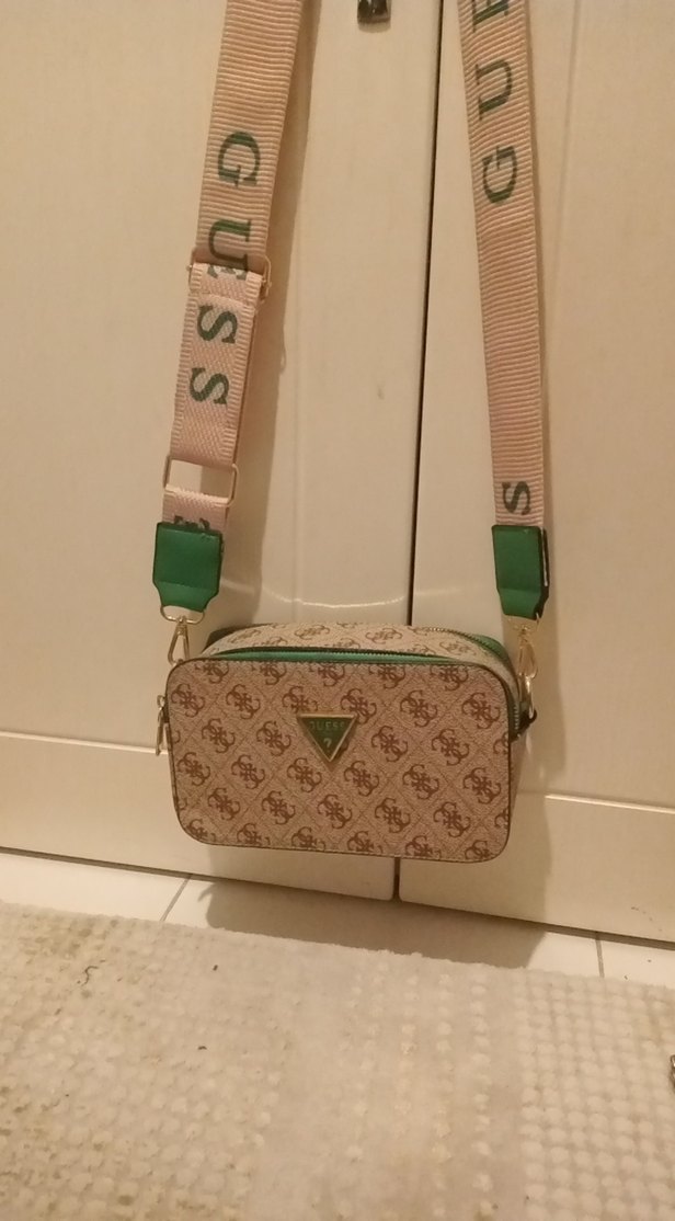 Yeşil renkli, desenli ve ayarlanabilir marka askılı, sentetik kumaştan yapılmış çantası. Sokak modasına uygun ve GUESS logosu bulunur.