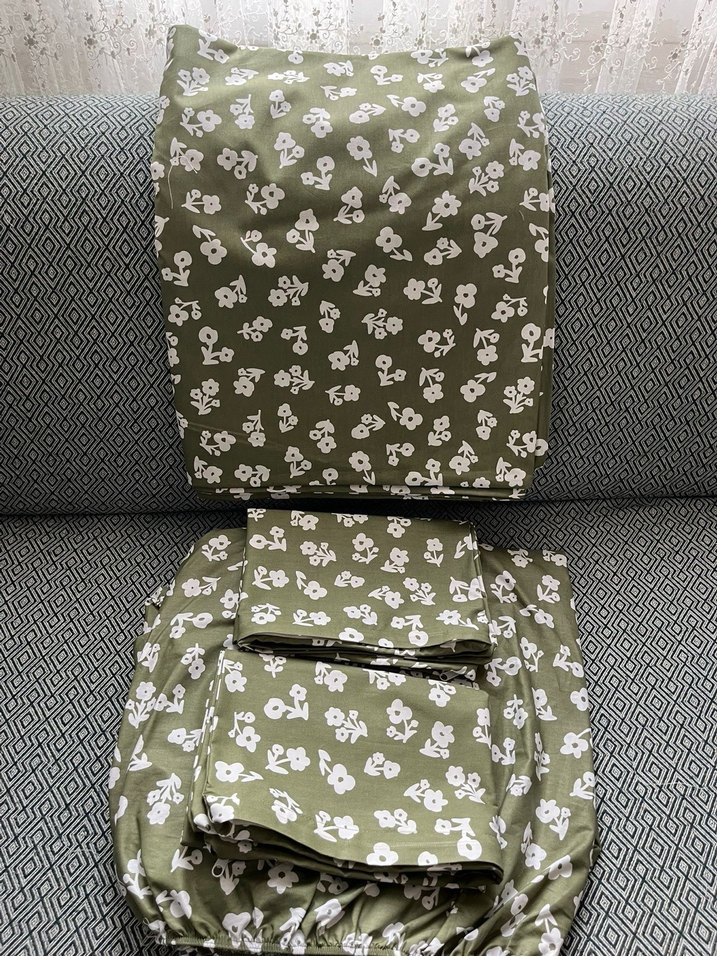 Haki renkli, beyaz çiçek desenli nevresim ve çarşaf takımı, yumuşak kumaşıyla rahat ve şık bir uyku ortamı sağlar.