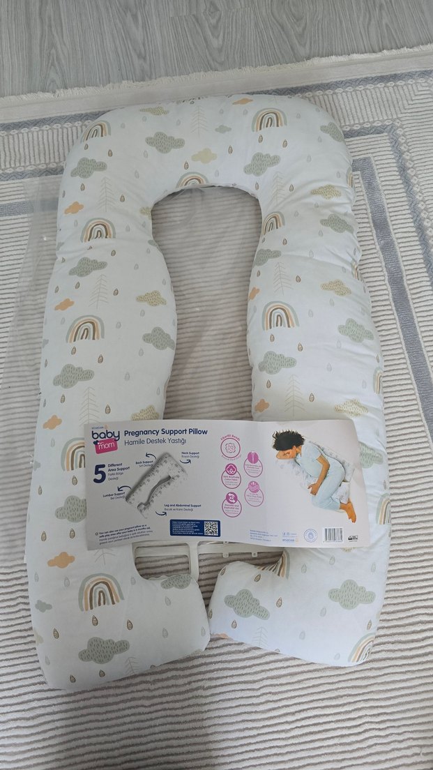 Beyaz zemin üzerinde pastel tonlarda gökkuşağı ve bulut desenli hamile destek yastığı, hamilelik ve emzirme sürecinde konfor sağlar.