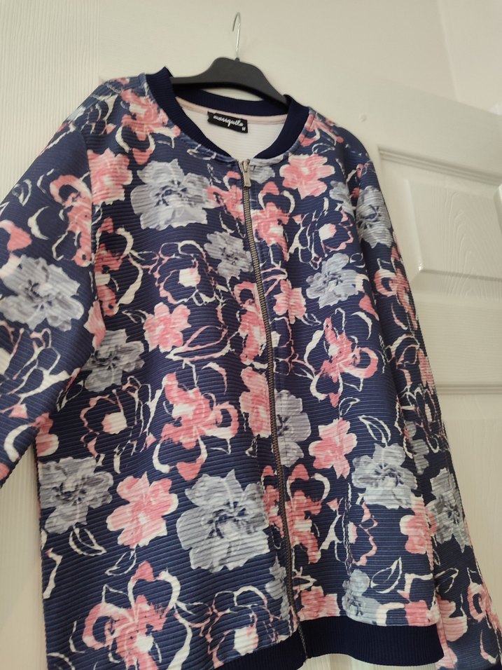 Uzun kollu, fermuarlı, desenli, Crew neck yaka ve pembe-gri çiçek desenleriyle rahat sokak stiline uygun.