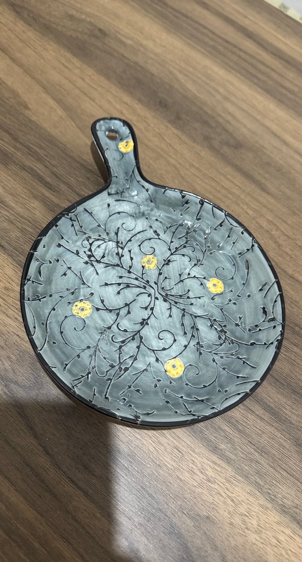 Çok renkli renkte, desenli ve küçük sarı detaylara sahip, saplı ikramlık tabak. Yeni gibi, ihtiyaç fazlası