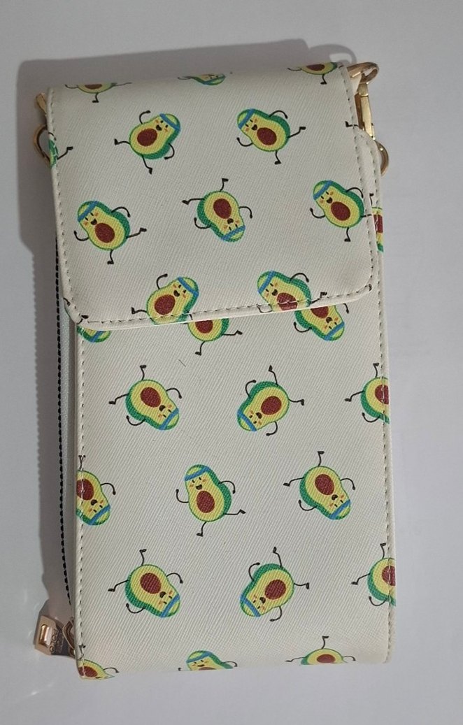 Kadınlar için çapraz çanta, hafif sentetik kumaş üzerine eğlenceli avokado desenli. Fermuarlı ve kapaklı, günlük kullanıma uygun bohem ve minimal tarzda.