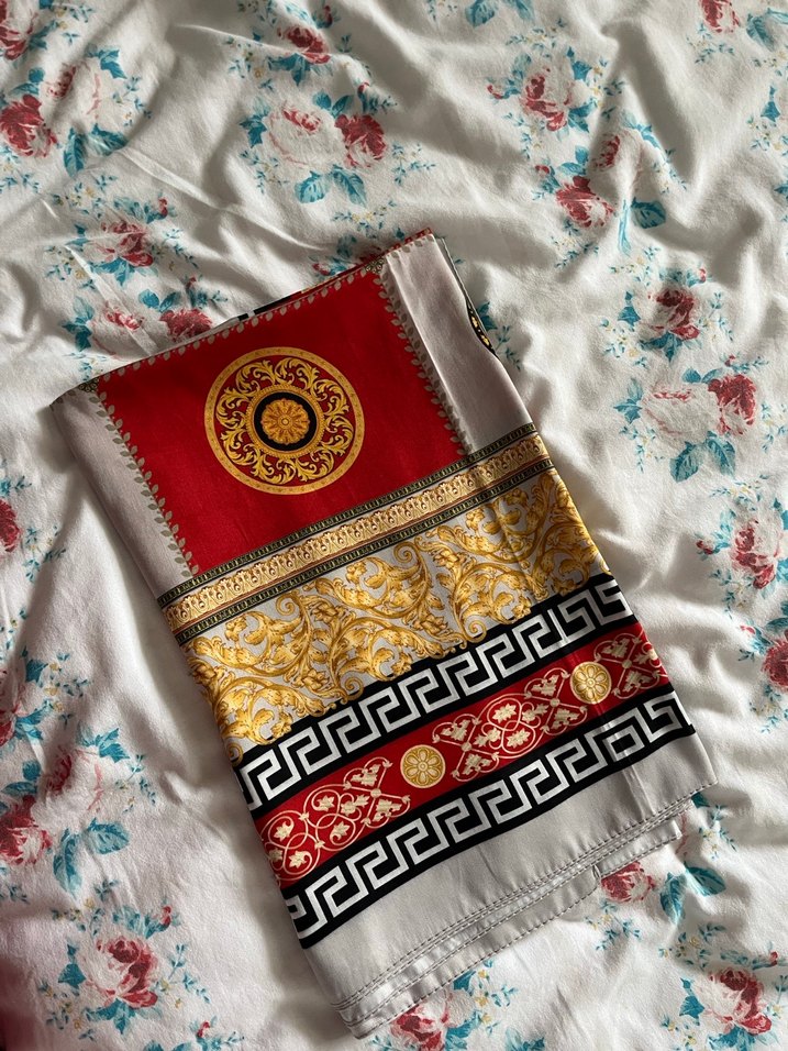 Kadınlar için drapeli, kırmızı ve gri tonlarda, altın detaylı desenlerle bohem ve retro tarzda şal.