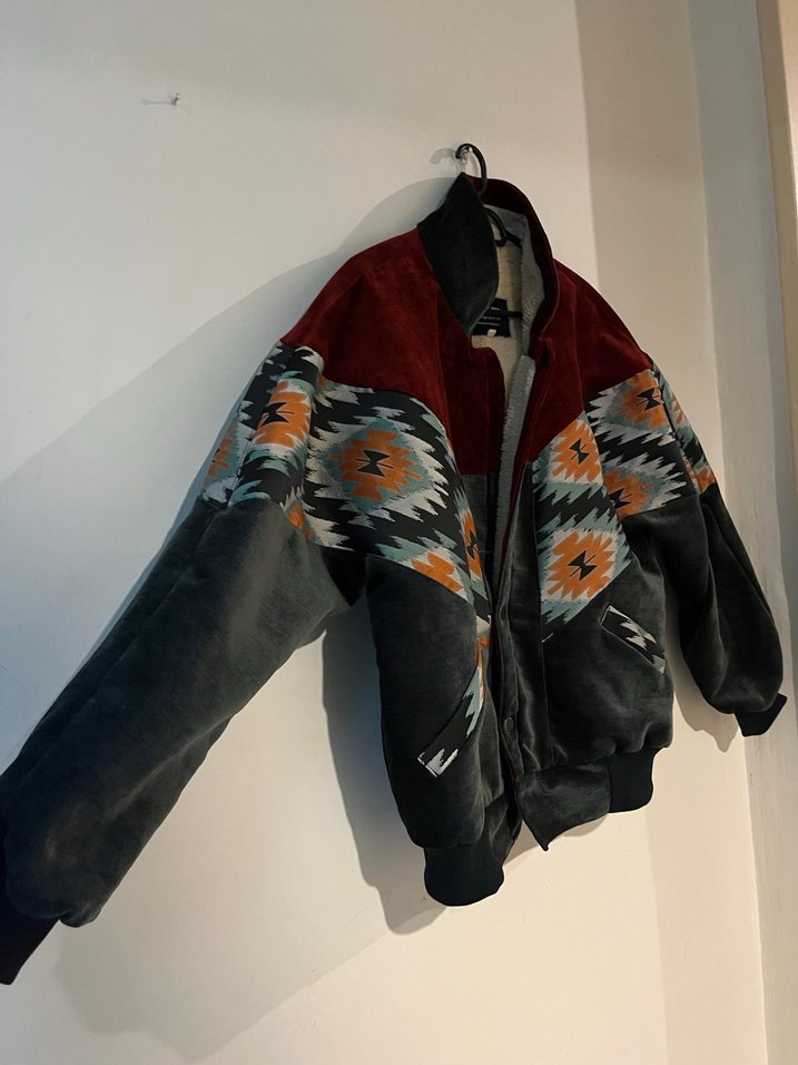 Vintage güzel bir ceket. Mont bile denebilir sıcak tutuyor. Kusuru yoktur. Kadın bomber ceket, bol kesim, uzun kollu ve yüksek yakalıdır. Koyu çok renkli desenli ve fermuarlıdır. Yumuşak ve sıcak kumaştan günlük kullanıma uygundur.
