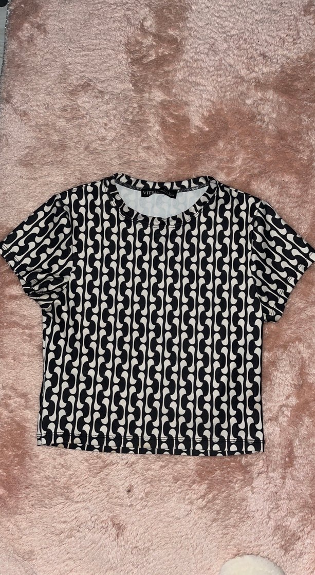 Kısa kollu, tekne yaka, siyah baskılı kadin tişörtü, yumuşak sentetik kumaştan, şık ve rahat sokak tarzı için uygun.