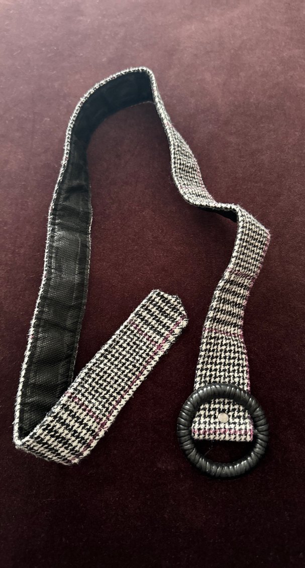 Bordo ve siyah desenli sentetik kumaştan, yuvarlak siyah tokalı kemer.