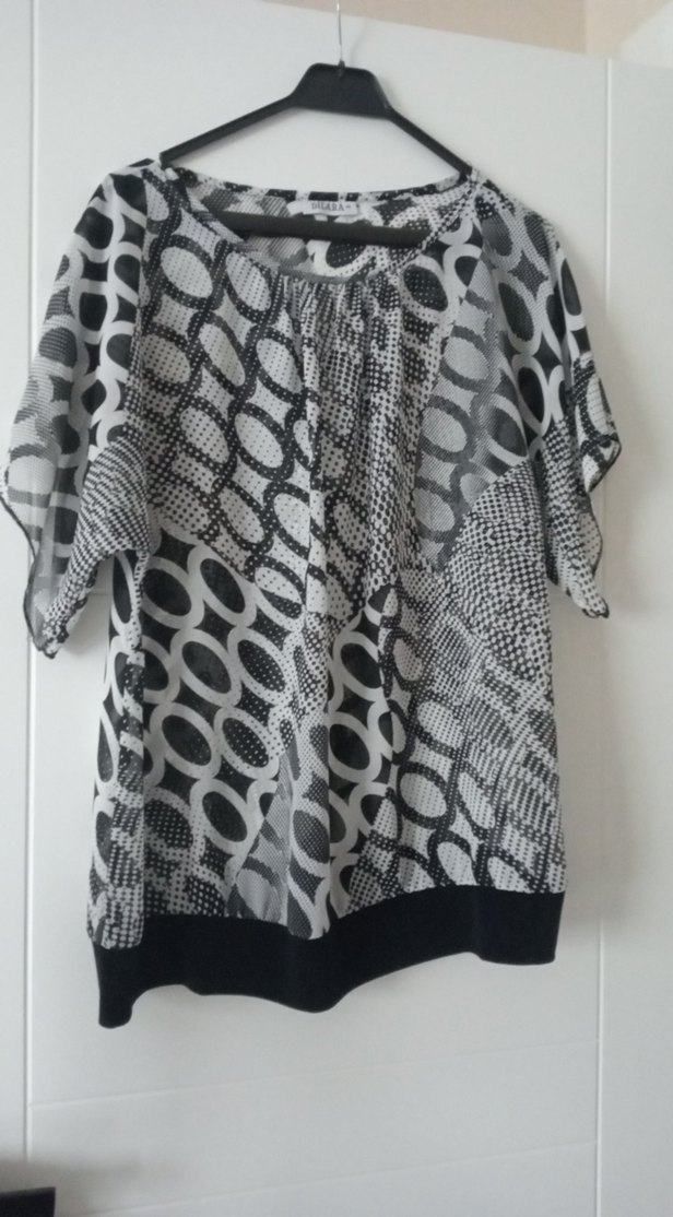 siyah beyaz gri karışımı desenli kadın bluz, kısa kollu, kayık yaka ve bol kesimdir, drapeli detaylar içerir, günlük veya gece yemeklerinde ve düğünlerde kullanıma uygundur.