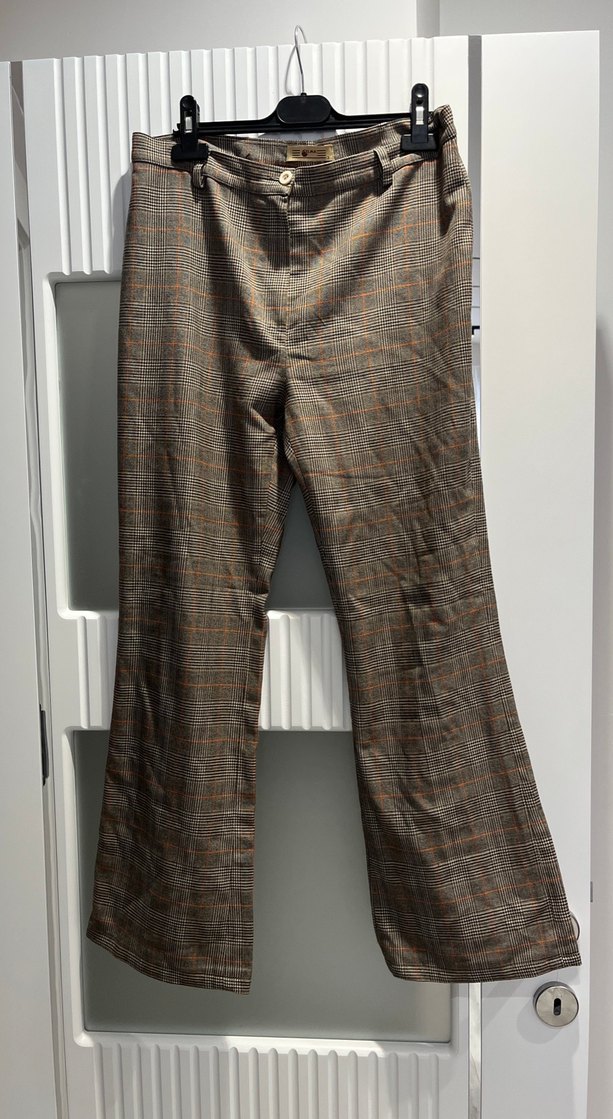 desenli, kahverengi ve gri tonlarda, keten kumaştan yapılmış, normal boy kadın kumaş pantolon.