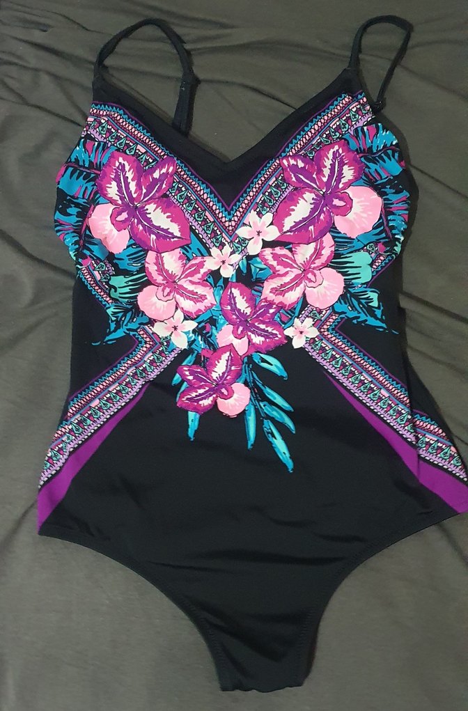 Boncuk detaylı, mor ve pembe çiçek desenli, askılı, vücuda oturan kadın mayo. Midi boyda ve günlük kullanıma uygun.