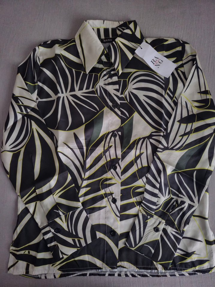 Bu kadın gömlek, uzun kollu ve düğmeli ön yapıya sahip, canlı desenli çok renkli bir tasarıma sahiptir. Salaş kesim ve tekne yakalıdır.