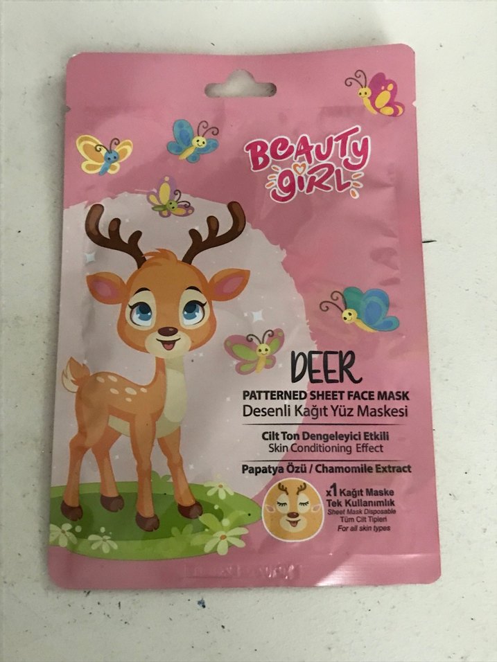Papatya özlü, cilt tonunu dengeleyen desenli kağıt yüz maskesi, sevimli geyik figürüyle pastel renkte.
