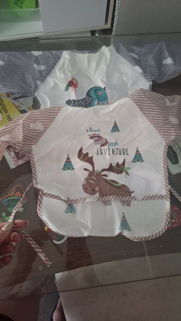 Desenli hayvan ve çadır figürlü açık kahverengi bebek önlüğü, bağlama ipleri bulunur. aktivite önlüğü cepli, ayarlanabilir