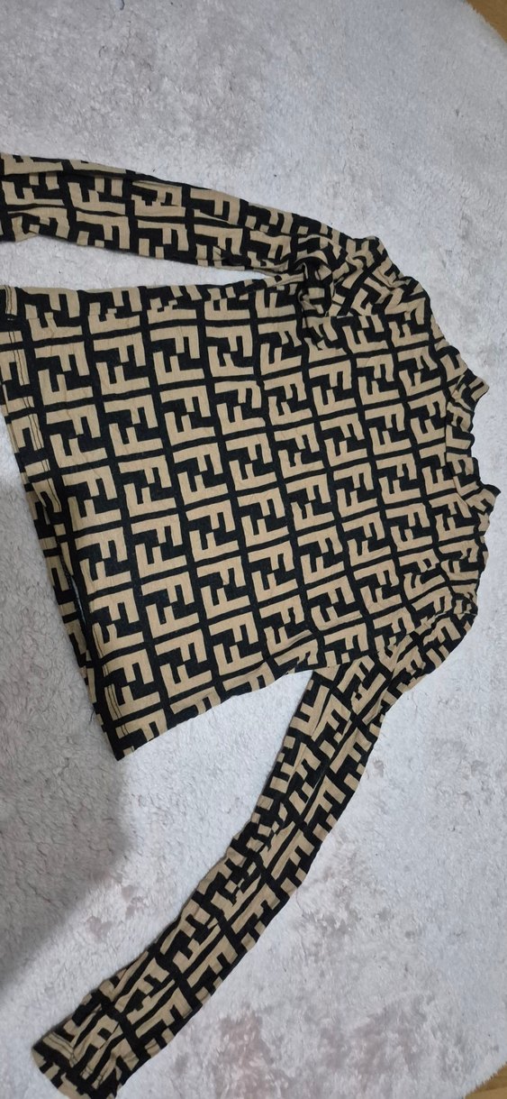 Koyu kahverengi, desenli ve boğazlı uzun kollu, vücuda oturan kadın bluz, günlük rahat kullanım için uygundur.