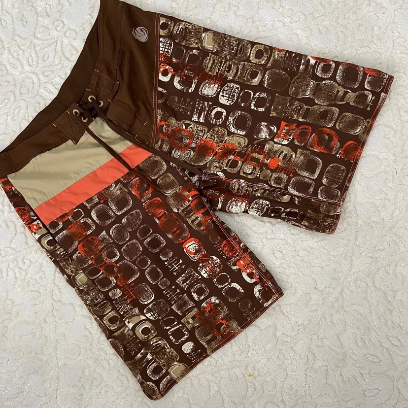 Bol kesim, tokalı bel detayına sahip kahverengi desenli erkek mayo şort, retro ve sokak stilini yansıtıyor.