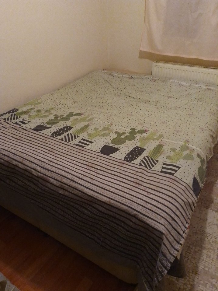Kahverengi ve gri tonlarda, bitki desenli bordürlü baskılı yatak örtüsü. Yatağı tamamen kaplar, yumuşak dokulu. ️