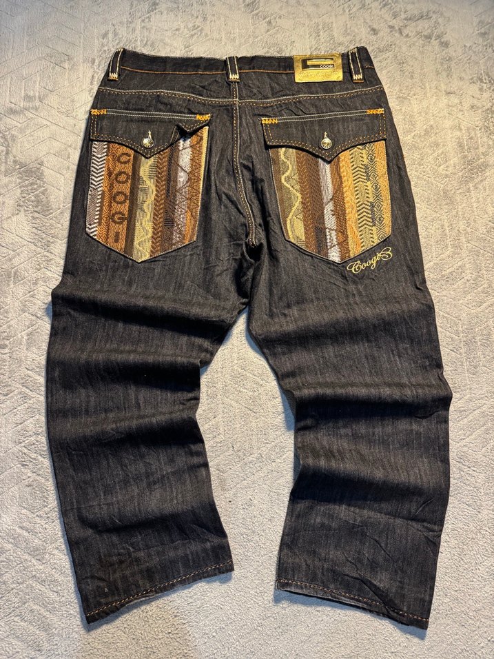 Kahverengi tonlarında, desenli arka ceplere ve kemerli bele sahip bol kesim kot pantolon, günlük sokak stili için uygundur.