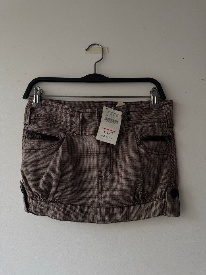 Yumuşak keten kumaştan, desenli ve kahverengi kısa mini etek. Kemer detaylı, rahat kesimli ve günlük sokak stili için uygun.