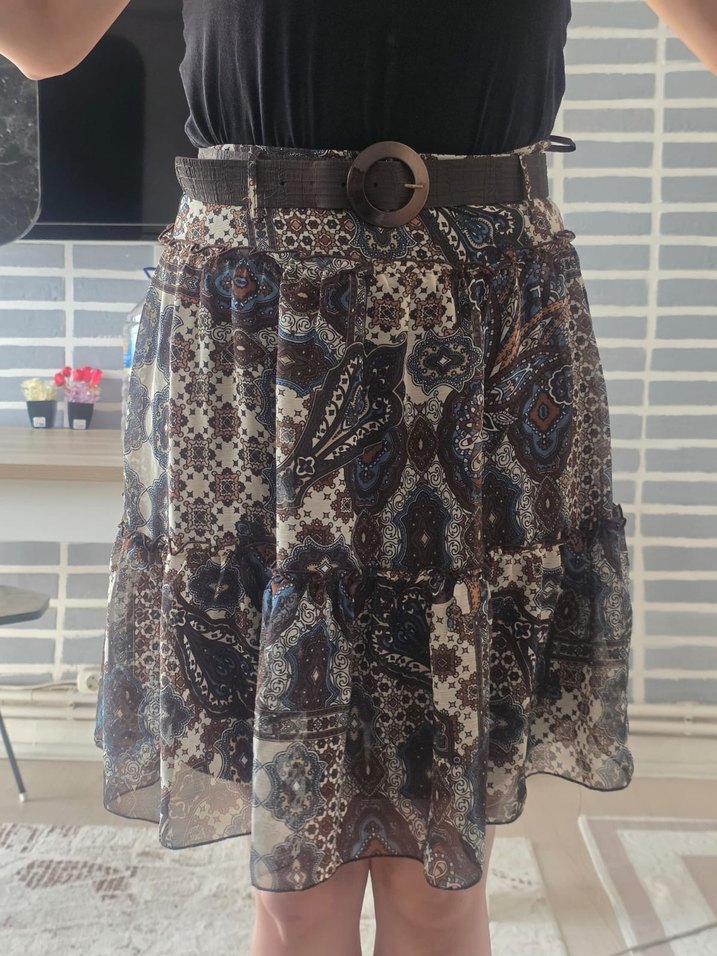 Kahverengi desenli midi boy bohem etek, bol kesim ve kemerli. Yumuşak sentetik kumaştan, günlük kullanıma uygun.