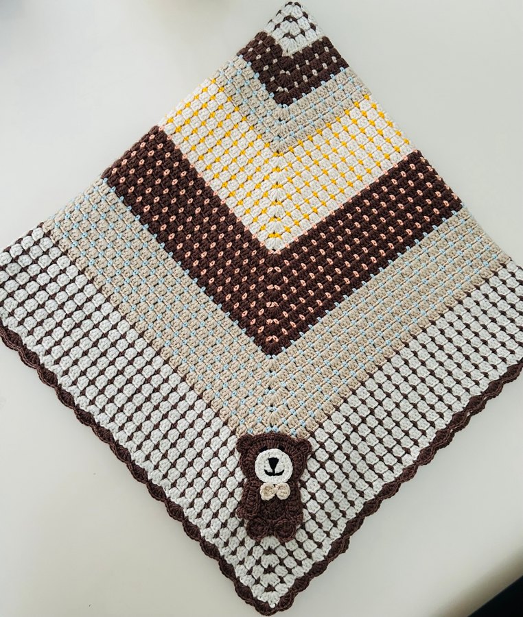 Bu çocuk battaniyesi, kahverengi, gri ve sarı tonlarda desenli örgü kumaştan yapılmıştır. Yumuşak dokusu ve sevimli ayı süsü vardır.