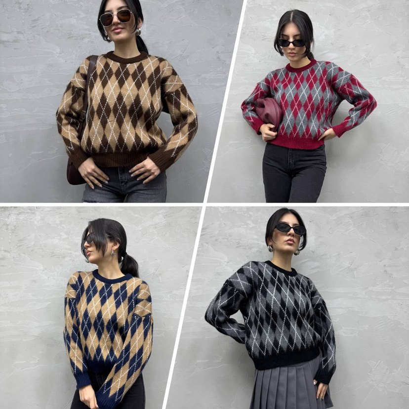 Örgü kumaştan, uzun kollu ve yuvarlak yakalı, desenli kahverengi kadın kazak. Rahat kesimiyle günlük kullanıma uygundur. Siyah ve kahverengi rengi mevcuttur. Standart bendendir.