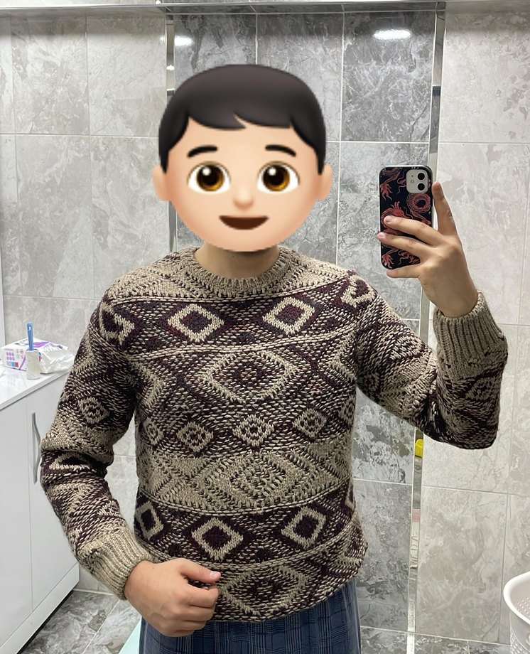 Kahverengi ve gri tonlarda desenli, triko dokuma, bisiklet yaka ve uzun kollu, vücuda oturan kazak. Rahat ve şık bir günlük tercih.