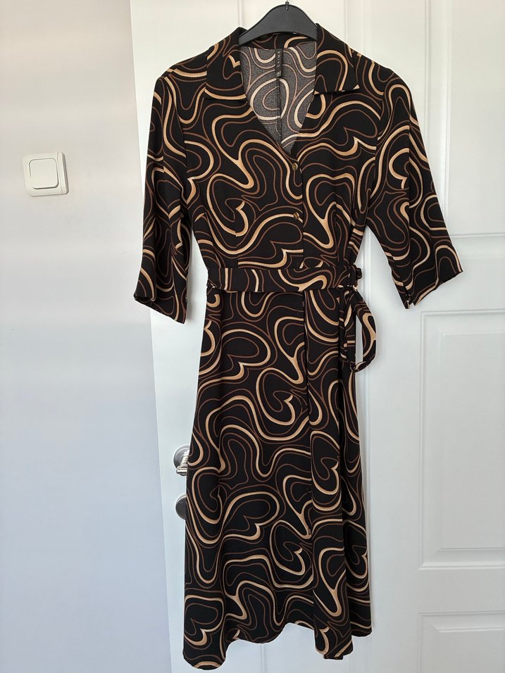 Uzun, fitted kesime sahip bu kahverengi desenli elbise, V yakalı ve drapeli tasarıma sahiptir. İpeksi kumaştan yapılmıştır, askılı kolludur ve ofis için uygundur.