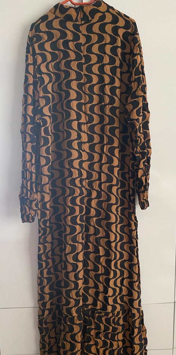Kahverengi desenli, uzun kollu ve drapeli kadın elbisesi. İpek gibi dokusu ve bol kesimiyle retro ve modern tarzı bir araya getirir. Günlük kullanıma uygun bohem şıklık sunar.