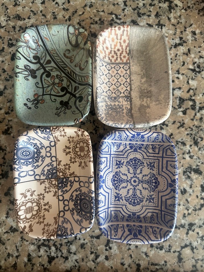 Dört adet renkli ve desenli dikdörtgen çerezlik kase. Masa sunumuna şık bir dokunuş sağlar. ️