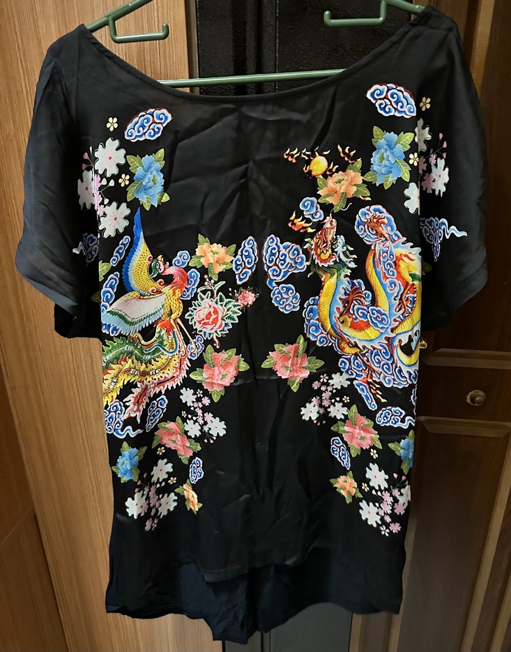 Kayık yaka, kısa kollu, bol kesim kadın bluz. İpek gibi dokulu kumaş, çok renkli desenlerle bohem tarzı yansıtıyor. Günlük kullanıma uygun.