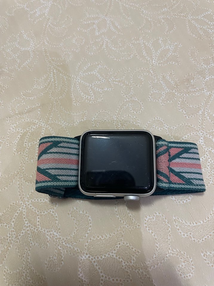 Kare ekranlı, yan düğmeli ve renkli desenli kayışa sahip koyu renkli akıllı saat. ⌚