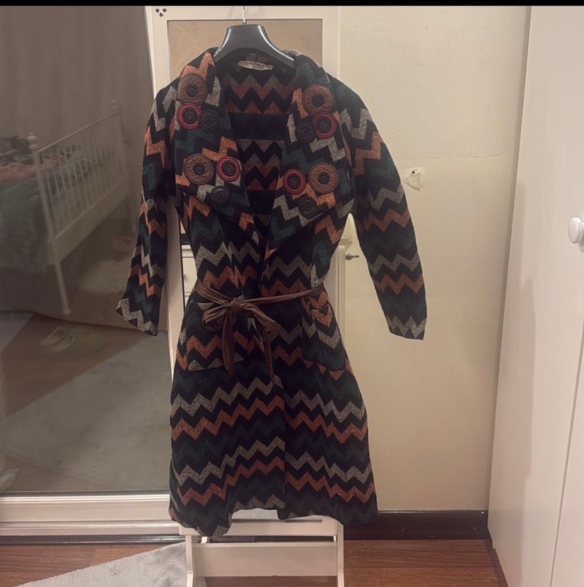 Desenli, uzun ve kemerli bu bohem kadın kabanı, fit kesim ve yaka detayına sahiptir. Çok renkli ve uzun kolludur, günlük kullanıma uygundur.